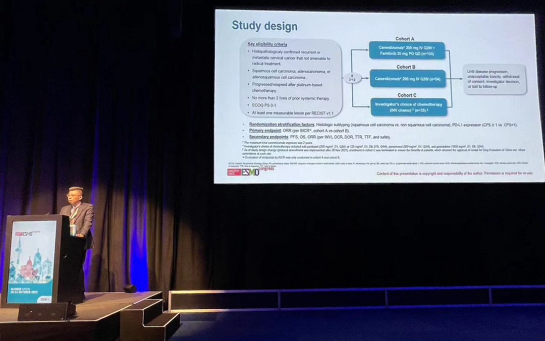 有望为宫颈癌患者带来治疗新选择10月22日,金年会金字招牌诚信至上医药创新药卡瑞利珠单抗联合法米替尼对比卡瑞利珠单抗单药或研究者选择的化疗治疗复发转移性宫颈癌随机、开放、对照、多中心的Ⅱ期临床研究(SHR-1210-Ⅱ-217) 亮相2023 ESMO大会简短口头报告现场3。该研究由复旦大学附属肿瘤医院吴小华教授团队开展,吴小华教授在现场公布了该重磅研究进展。研究结果显示,在既往以铂为基础化疗失败后复发或转移性宫颈癌患者中,与单独使用卡瑞利珠单抗或研究者选择的化疗相比,卡瑞利珠单抗联合法米替尼显著提高了抗肿瘤活性,安全性可控,有望为晚期宫颈癌患者提供新的治疗选择。