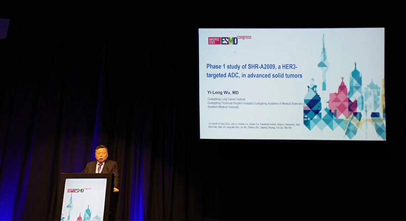 10月23日,金年会金字招牌诚信至上医药创新药、HER3靶向ADC药物SHR-A2009治疗晚期实体瘤的I期研究亮相2023 ESMO大会简短口头报告现场5。该研究由广东省人民医院的吴一龙教授牵头开展,吴一龙教授在现场公布该研究的重要进展。研究结果显示,SHR-A2009在经治晚期实体瘤患者中显示出可控的安全性和令人鼓舞的抗肿瘤活性。目前评估更高剂量的SHR-A2009在选定癌症类型(NSCLC和其他实体肿瘤)中作用的试验正在进行中。