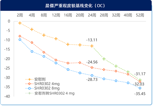 24周时,艾玛昔替尼4mg和8mg均能显著缩短晨僵时间(-41.39 min和-40.76 min),显著高于安慰剂组(-24,96 min);晨僵严重程度也显著减轻(-23.27和-26.60),明显优于安慰剂组(-11.45);随着治疗时间延长,晨僵时间和严重程度均持续改善至52周(图5)。