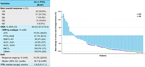 截至2024年12月20日,中位随访时间15.2个月,22例(32.8%)患者达到完全缓解,21例(31.3%)达到部分缓解,IRC评估的ORR为64.2%(95% CI,51.5-75.5)。在所有亚型中均观察到获益(ORR:AITL,70.3%[26/37];PTCL-NOS,57.1%[8/14];ENKTL-NT,50.0%[2/4];ALCL,ALK-,42.9%[3/7];ALCL,ALK+,50.0%[1/2];MEITL,100%[1/1];其他,100%[2/2])。在出现缓解的患者中,51.2%(22/43)的患者目前仍在缓解中,估计的中位DoR为18.7个月(95% CI,6.3-未达到[NR])。中位PFS为10.0个月(95% CI,3.7-15.7),中位OS尚未达到。安全性整体可控。